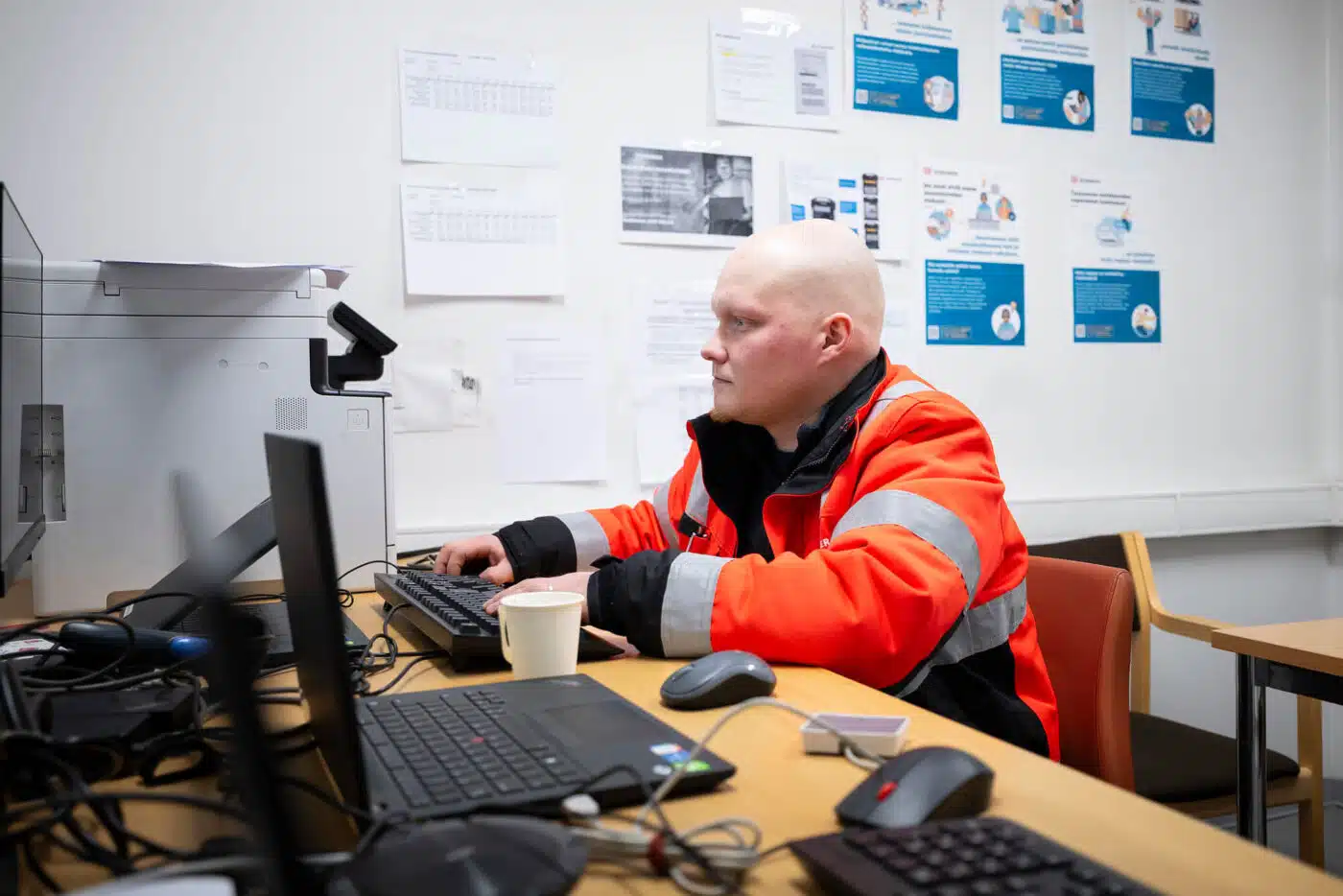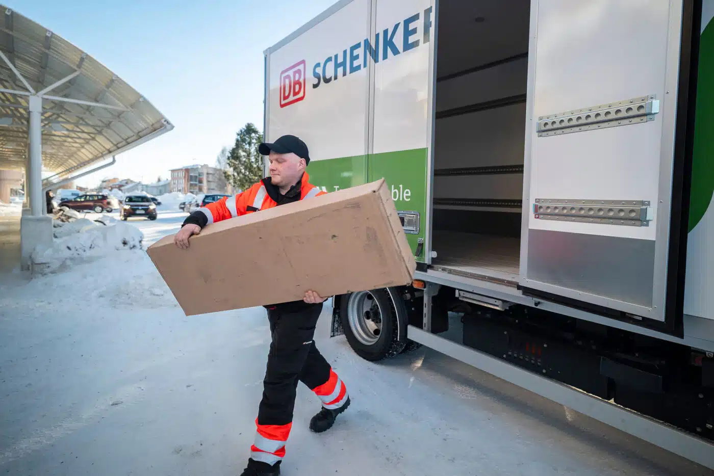 Zufrieden ist er in seiner Funktion als Terminalleiter auch mit der Nutzlast des 7,49-Tonners. Die liegt trotz der Batterien bei 3.200 kg. Mit einem Radstand von 3.400 mm kann der eCanter in dieser Konfiguration außerdem bis zu 15 Palettenstellplätze bieten. „In den passt gut was rein. Damit können wir die anderen beiden Lkw wirklich unterstützen“, erklärt Sami Määttä. Einziges Manko: Die Heizung an der Stirnwand des Kofferaufbaus läuft aktuell noch über einen zusätzlichen kleinen Biodiesel-Tank. Diese lokale Spezialanforderung ist den eisigen Temperaturen geschuldet und nötig, um sensible medizinische Produkte zu transportieren, die nicht einfrieren dürfen. Das ließ sich leider noch nicht elektrisch lösen, da es zu viel Energie aus den Fahrbatterien ziehen würde.