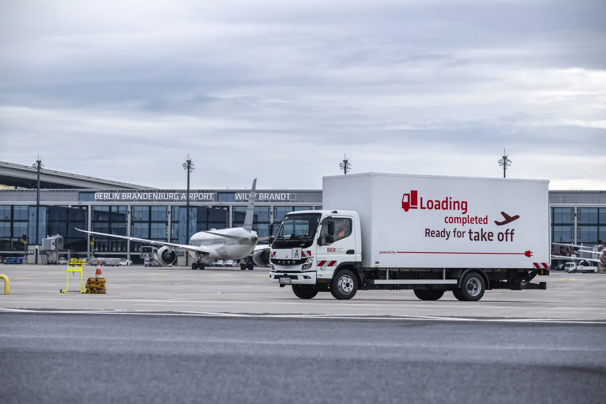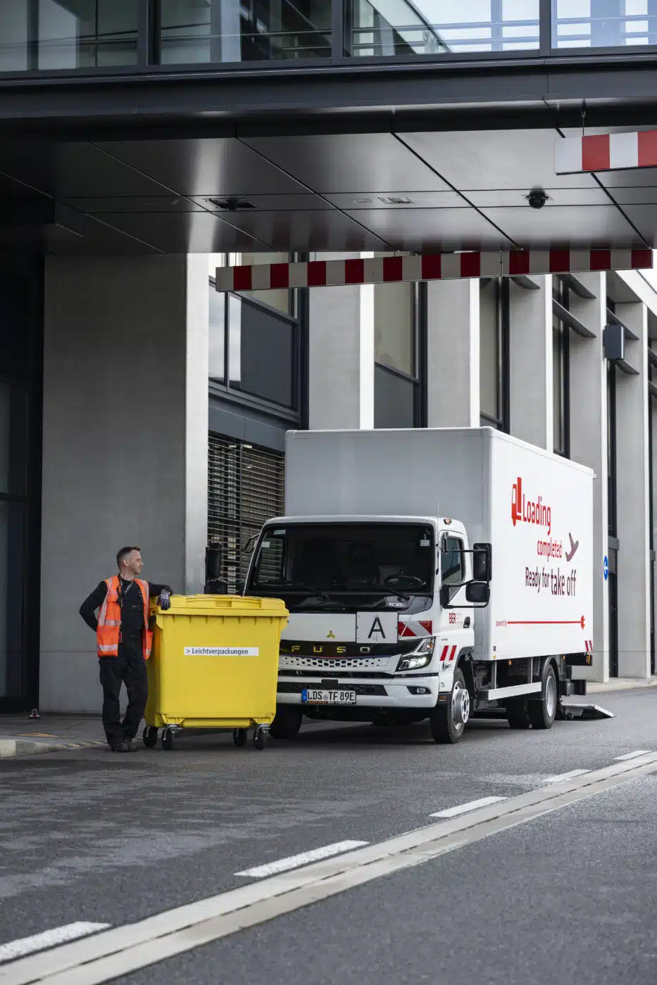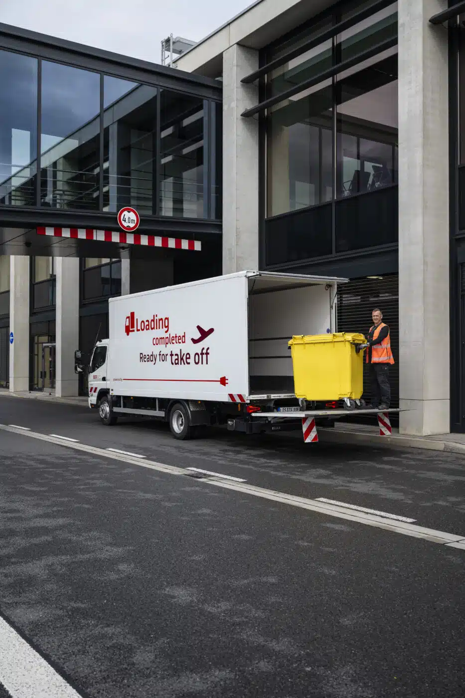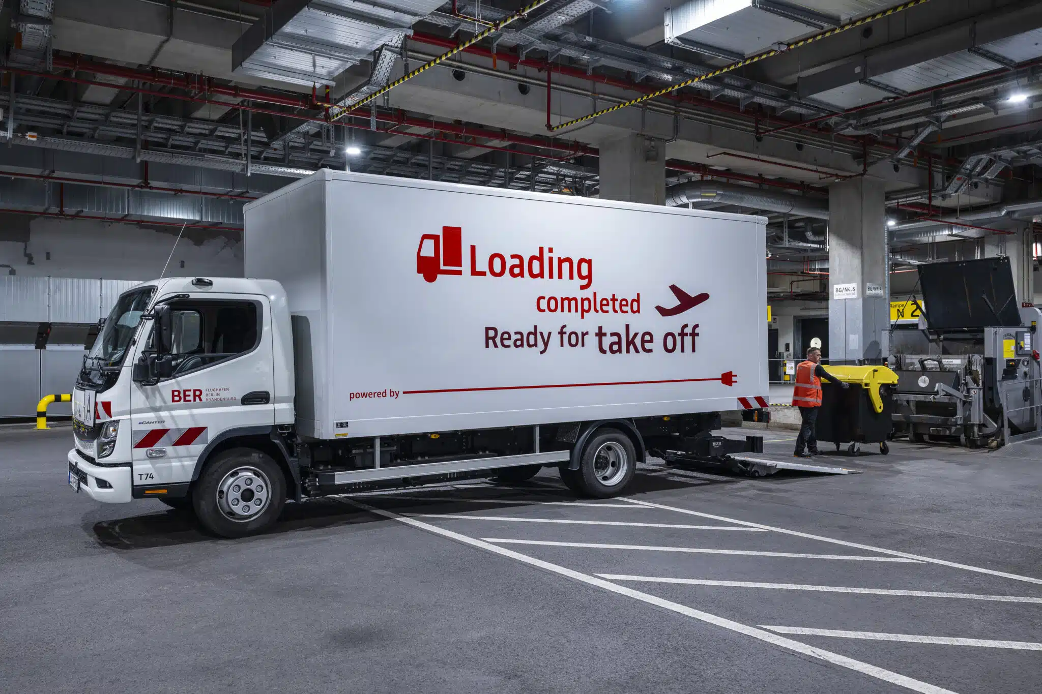 Depuis un an et demi, l’aéroport de Berlin-Brandebourg GmbH mise sur l’électromobilité dans le cadre de sa stratégie de développement durable pour le traitement de sa logistique interne des déchets et de l’élimination des déchets – comme le montre le FUSO eCanter 7C18e.